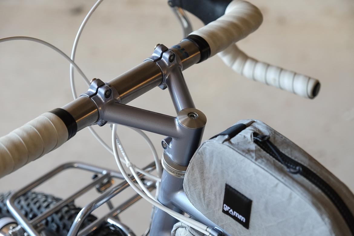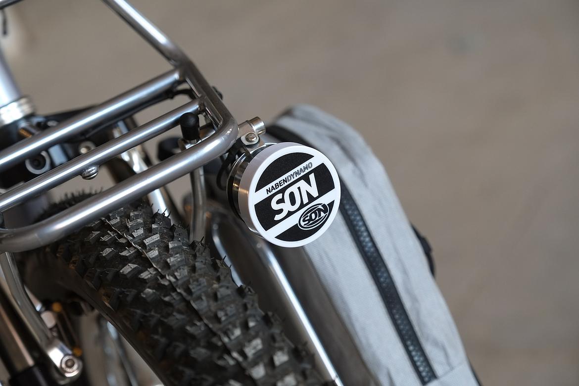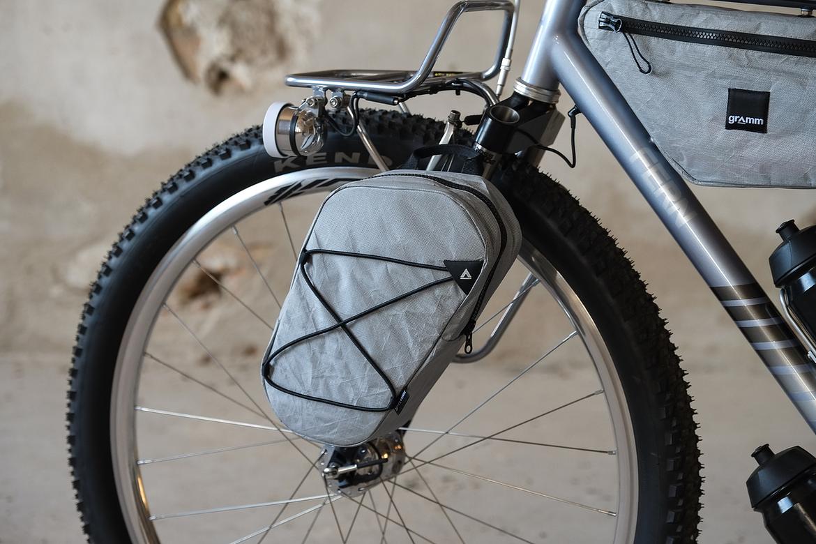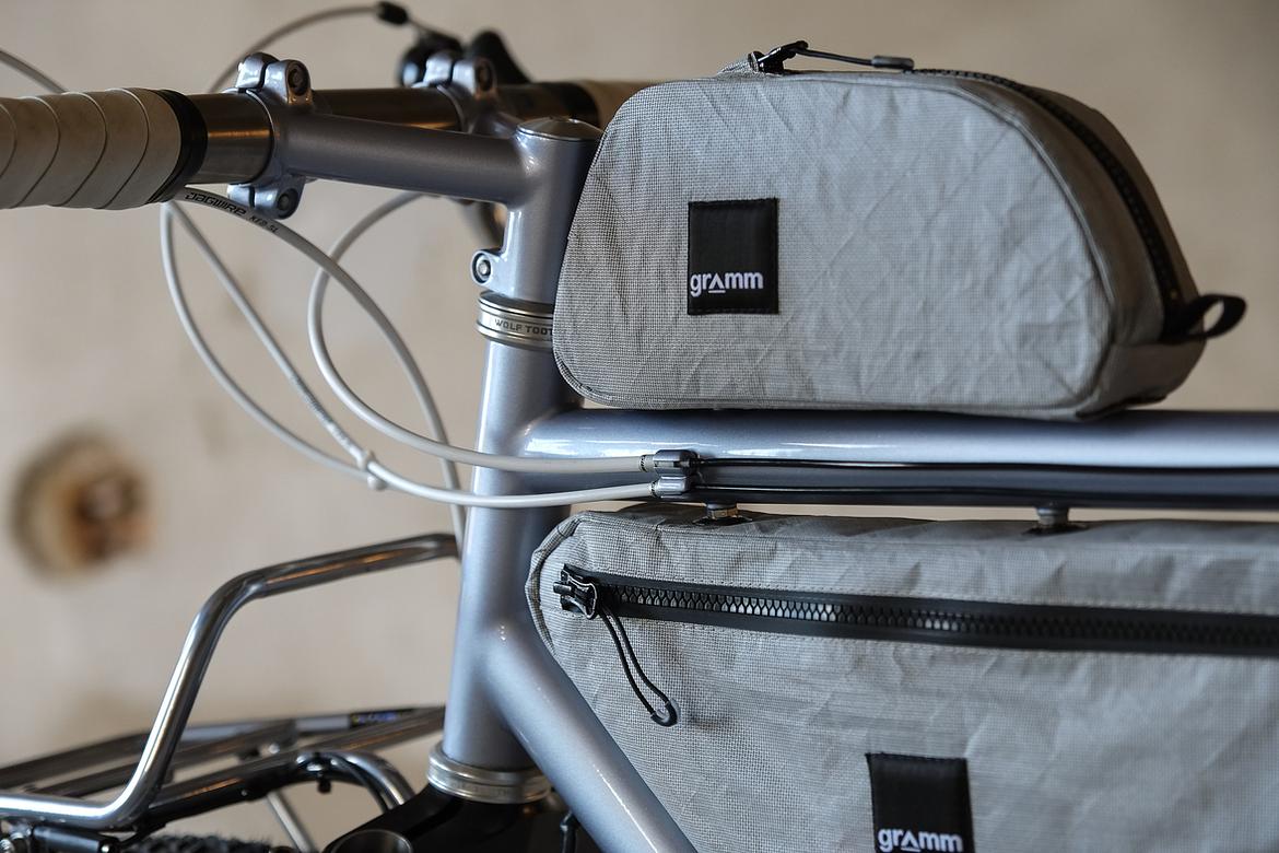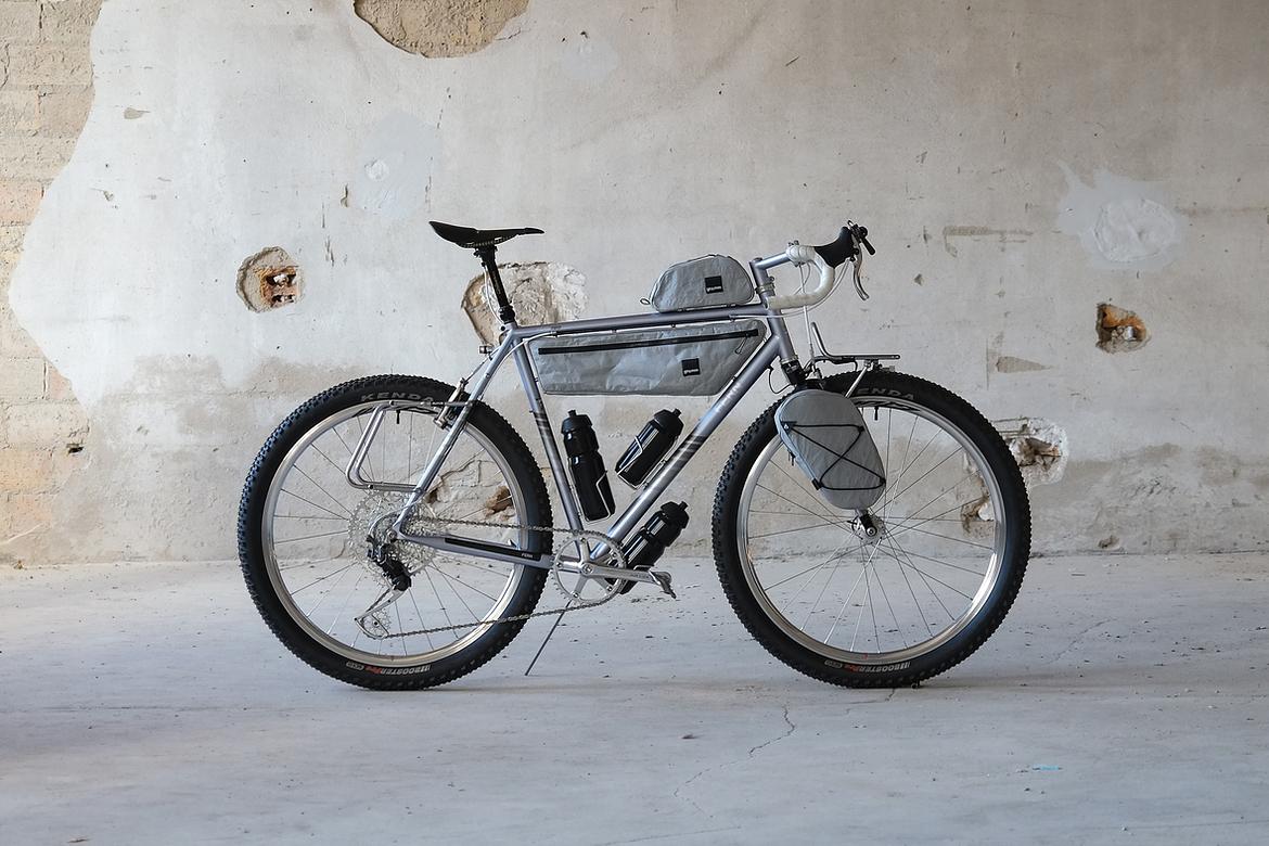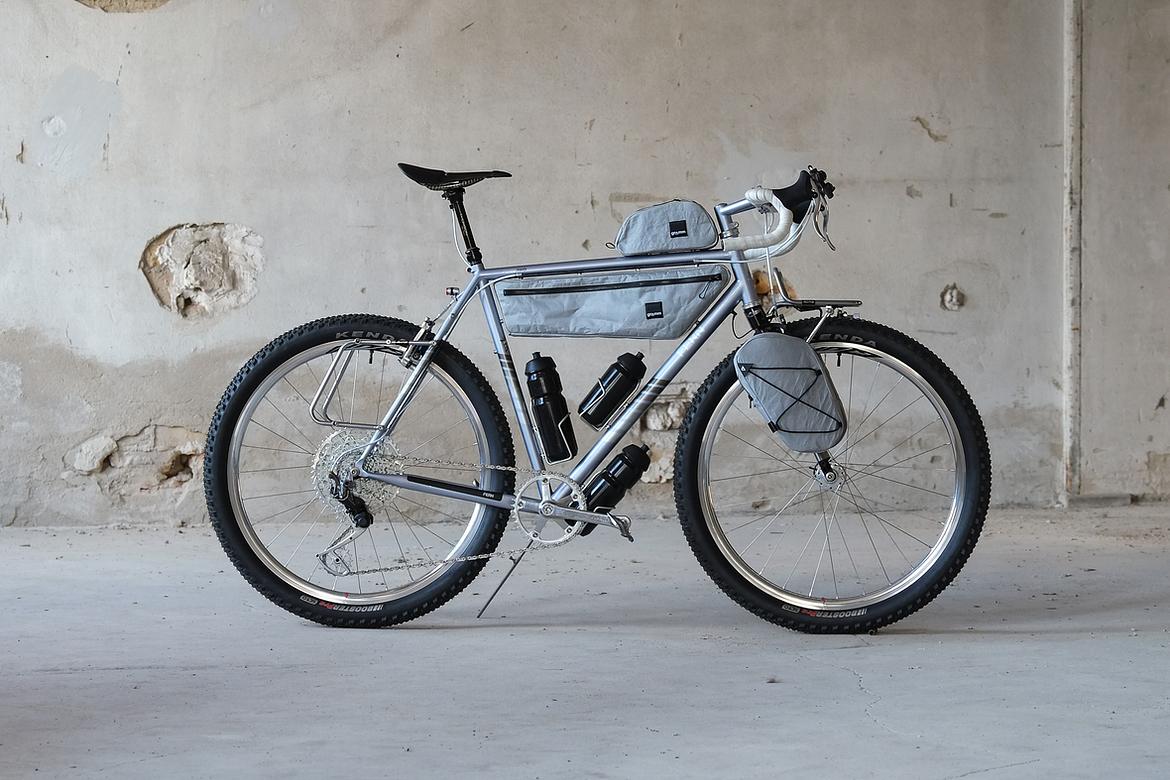 But the absolute icing on the cake of this bike is as usual and for sure the bags which are all created by my partner in all crimes, Tine of Gramm Tourpacking. They were all handmade here in Berlin from the absolute most exclusive Challenge Sailcloth materials and the silver color fabric just perfectly blends into this complete build.
