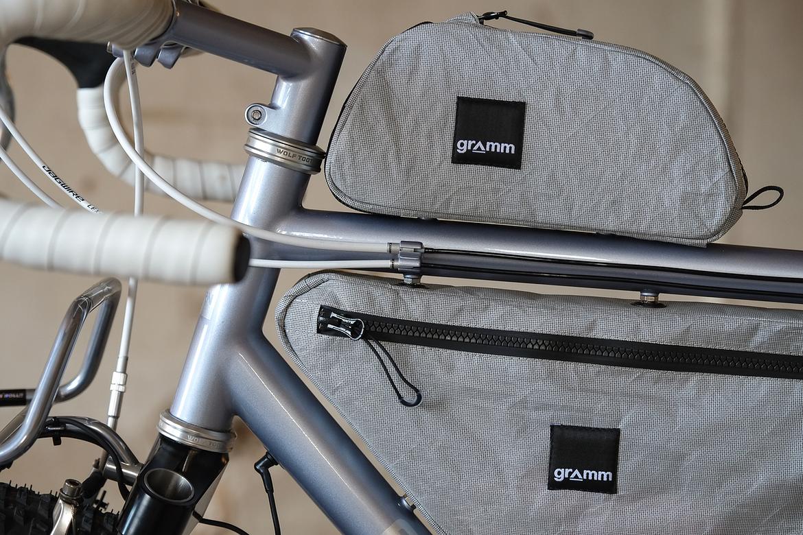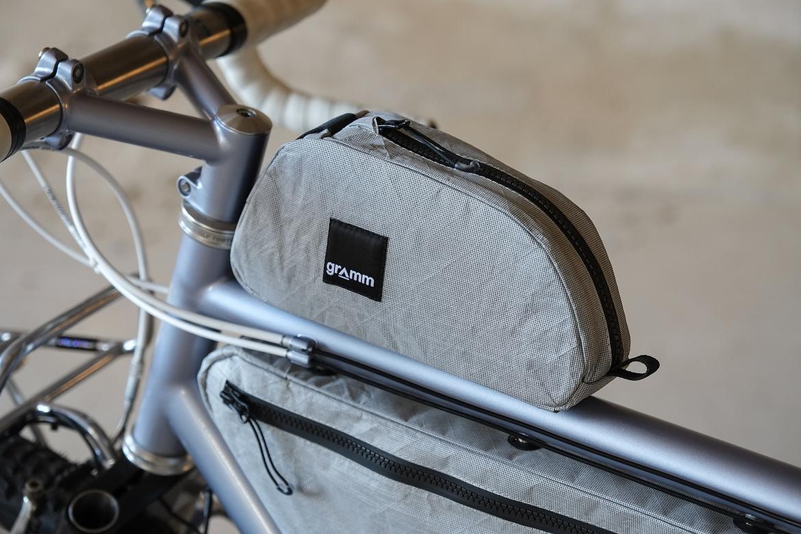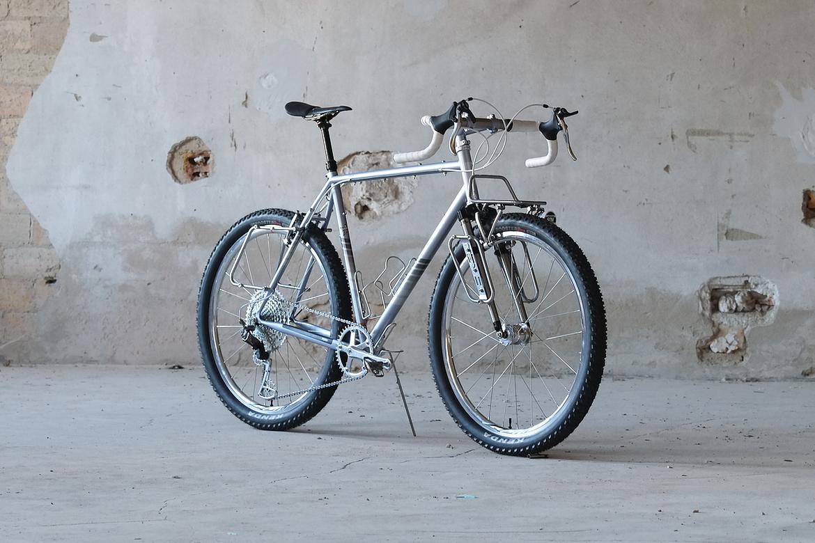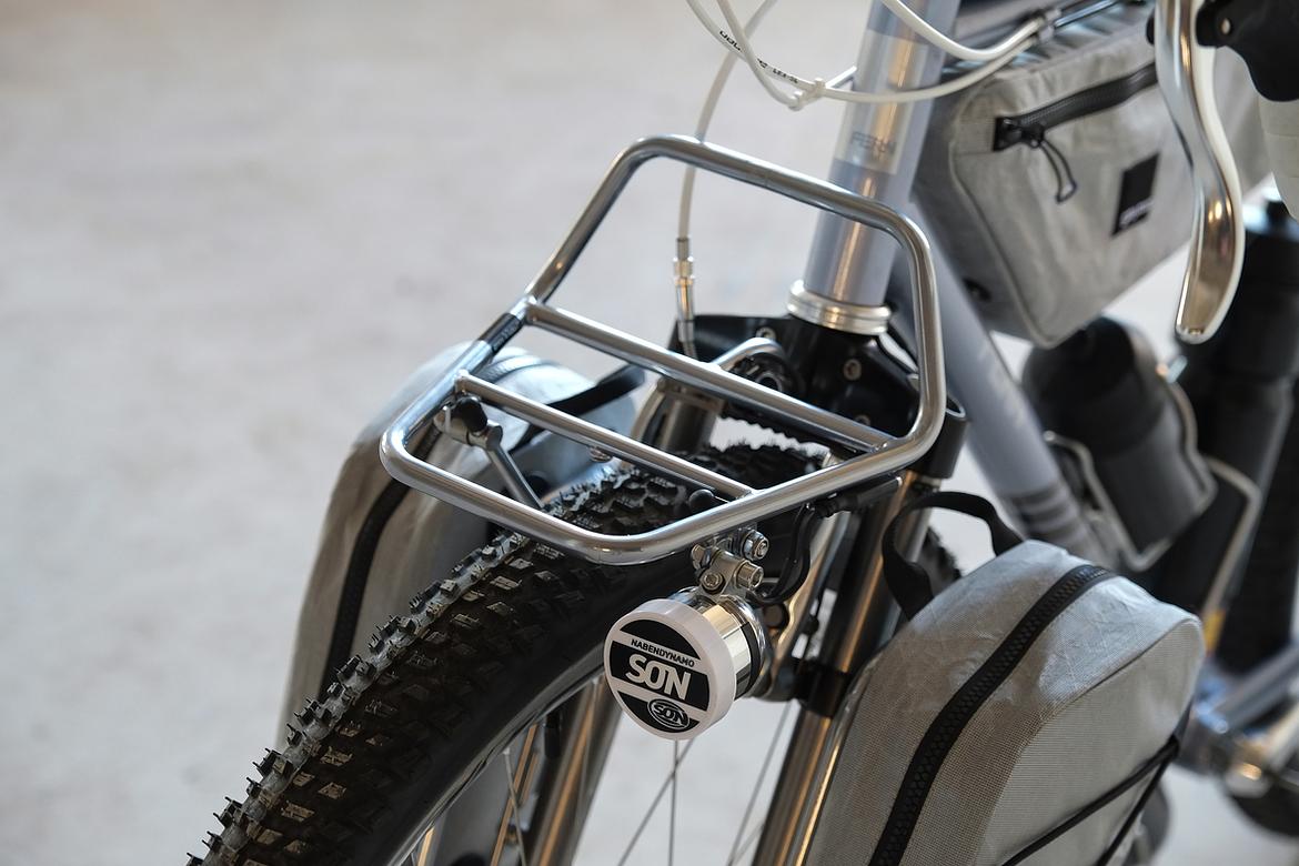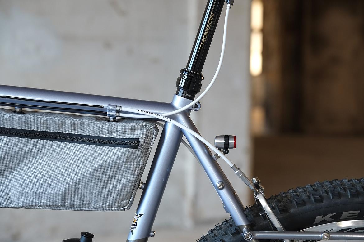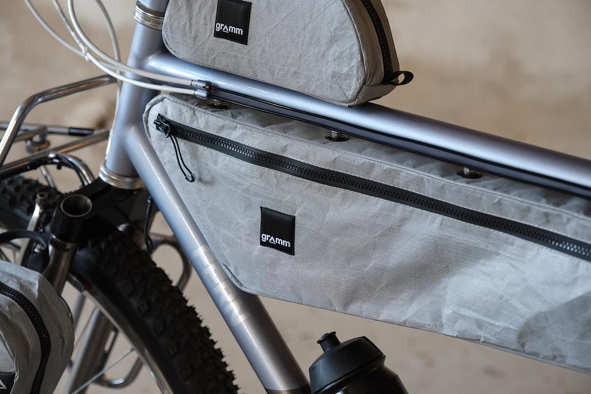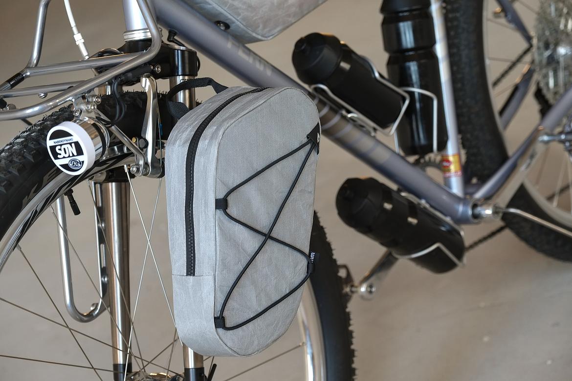But the absolute icing on the cake of this bike is as usual and for sure the bags which are all created by my partner in all crimes, Tine of Gramm Tourpacking. They were all handmade here in Berlin from the absolute most exclusive Challenge Sailcloth materials and the silver color fabric just perfectly blends into this complete build.